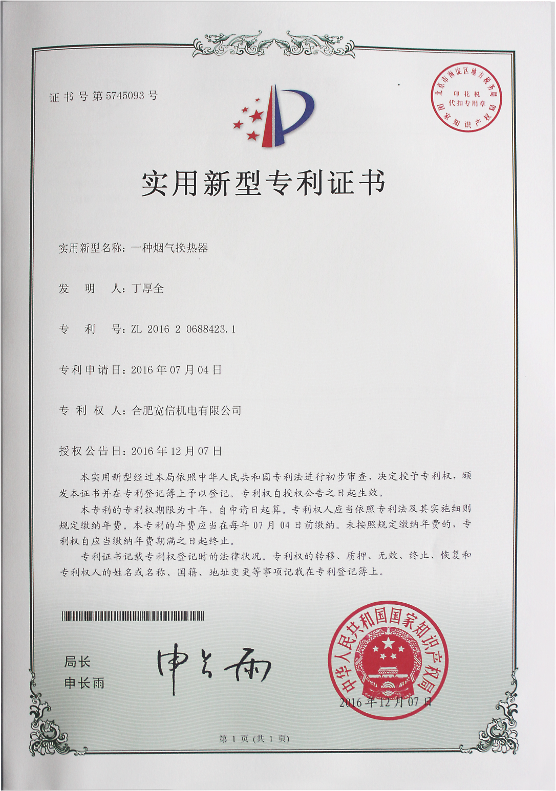 寬信實用新型證書